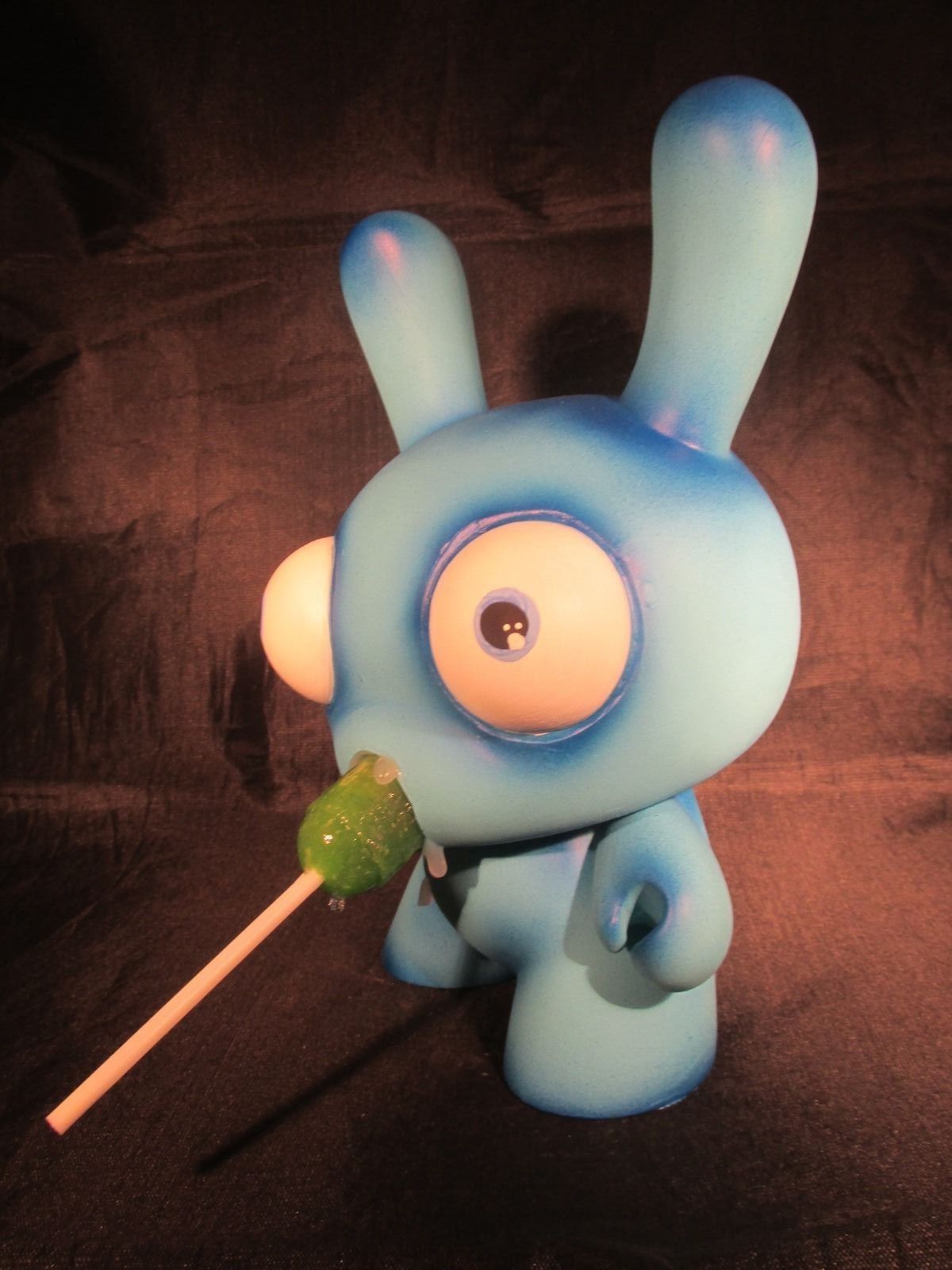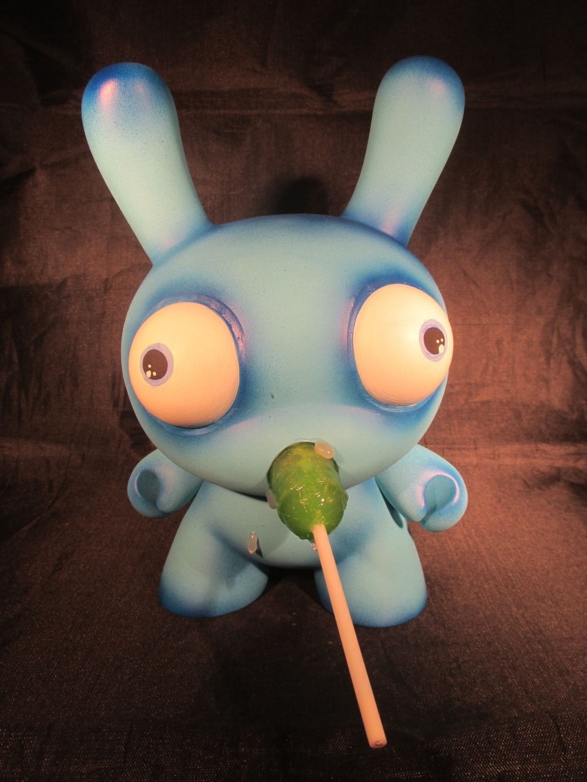 This is a Custom Blue 8″ Dunny with Lollipop Stuck in his Mouth, Signed by Shawn Wigs On the Bottom of the foot.