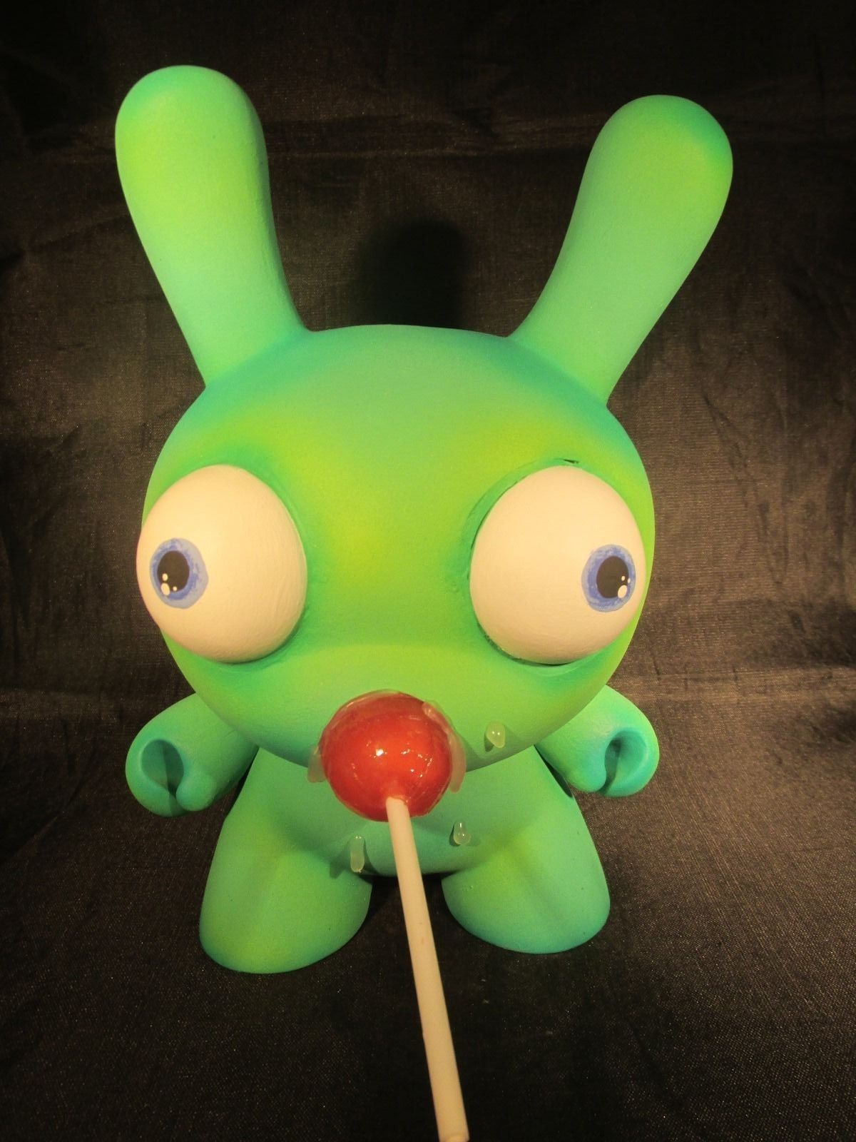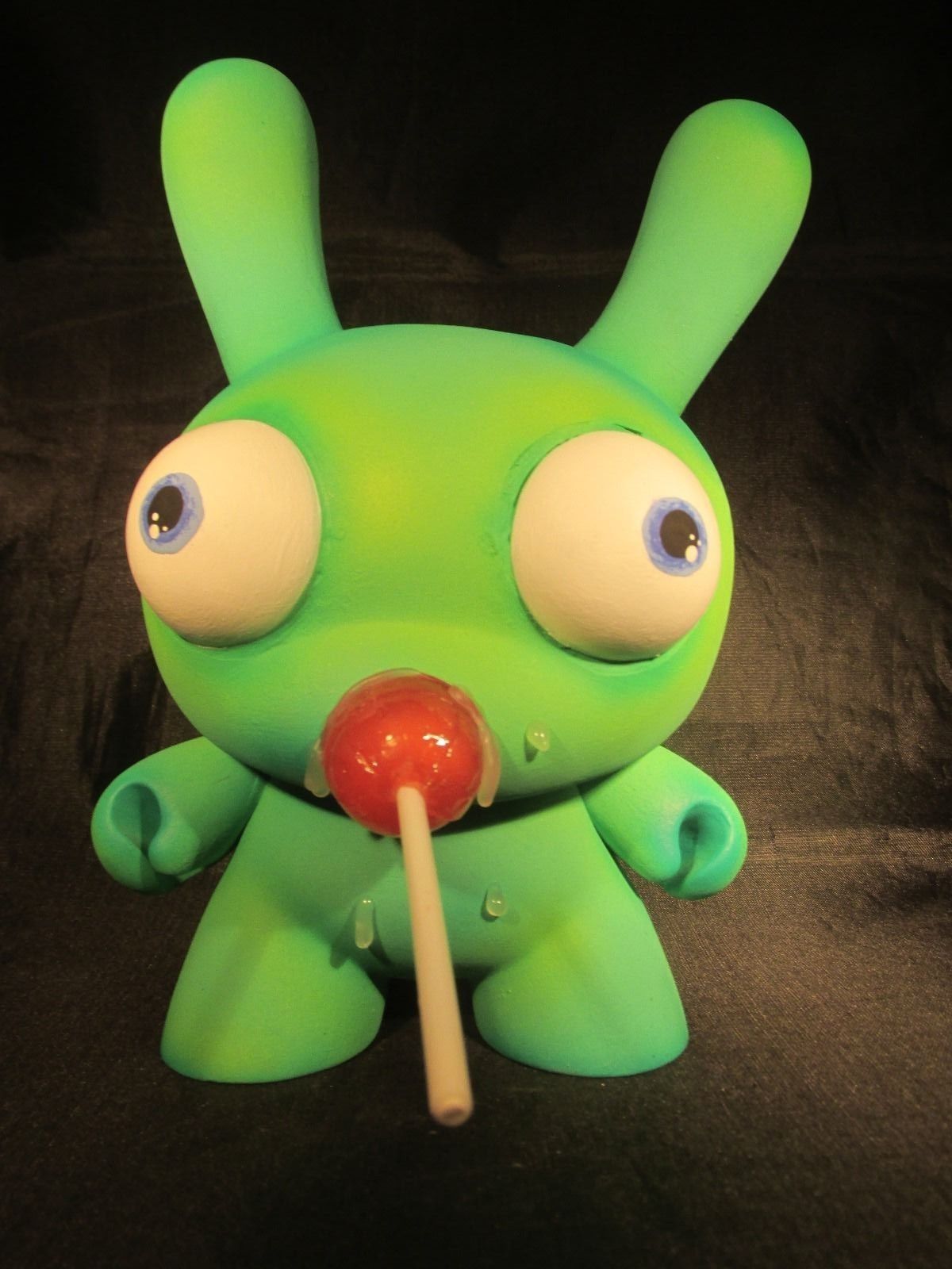 This is a Custom Green 8″ Dunny with Lollipop Stuck in his Mouth, Signed by Shawn Wigs On the Bottom of the foot.